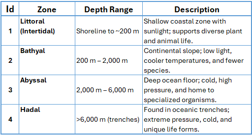 The benthic zone is the lowest ecological region in a body of water, including the ocean floor and sediment layers. It spans from shallow coastal areas to deep-sea trenches. Conditions vary from light and warm nearshore to dark, cold, and high-pressure in the deep. Organisms here, called benthos, include bacteria, worms, crustaceans, and sea stars. They play vital roles in nutrient cycling, decomposition, and supporting marine food webs. It's a key zone for biodiversity and ecosystem health.Classification of the benthic zone based on depth: