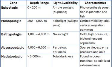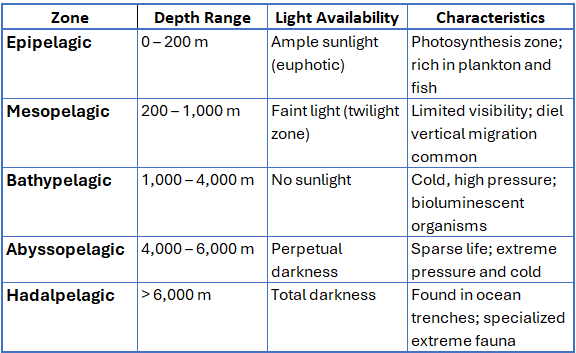 The pelagic zone refers to the open ocean water column, extending from the surface to the deepest parts of the ocean, excluding the sea floor. It is the largest marine ecological zone, characterized by its vertical layering based on depth, light penetration, and pressure. Organisms living in this zone, such as plankton, jellyfish, fish, squid, and whales, are adapted to life suspended in the water column, away from the ocean bottom. The pelagic zone plays a crucial role in global biogeochemical cycles, oceanic food webs, and climate regulation